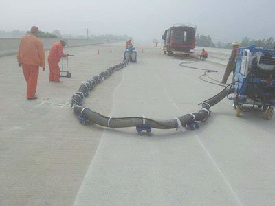 橋面表層混凝土面處理:防水層施工前應(yīng)先將橋面清掃干凈再對(duì)其進(jìn)行高程驗(yàn)收,以3m為一個(gè)斷面布置高程點(diǎn),用水準(zhǔn)儀精確超平。低洼處采用聚合物砂漿補(bǔ)平,高處先采用電鎬或風(fēng)鎬鑿**設(shè)計(jì)高程,然后用砂漿找平。橋面表層應(yīng)做到平整、無尖銳異物,不起砂、不起皮及無凹凸不平現(xiàn)象,無浮碴、浮灰、油污等,同時(shí)擋碴墻根部應(yīng)無蜂窩、麻面。處理后的橋面表層平整度的要求:用1m長靠尺測量,空隙≤3mm,空隙只允許平緩變化,每米不應(yīng)超過一處。
